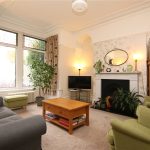 The entrance vestibule sets the tone with mosaic tiled flooring and coloured glass windows, leading into a hallway lined with original wood panelling and matching flooring. To the left lies a bay-fronted living room filled with light. Ornate arched alcoves frame the fireplace, deep skirting boards and high ceilings add to the sense of grandeur, and the room’s proportions reflect its period origins.