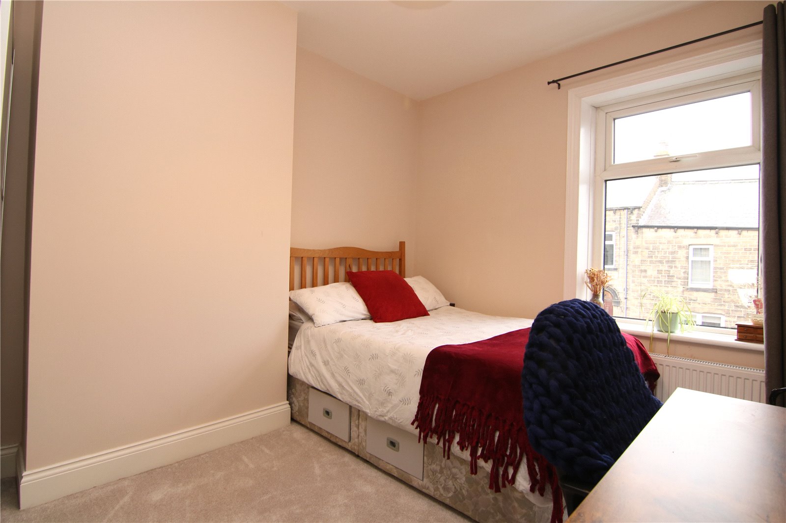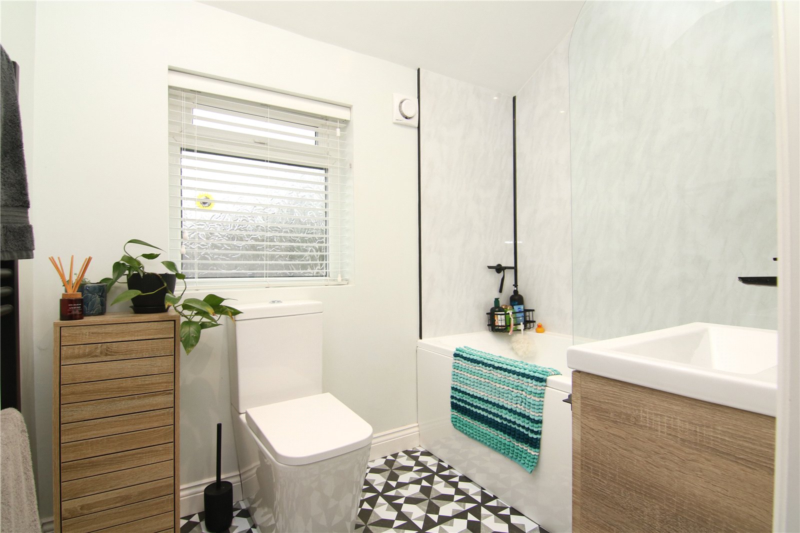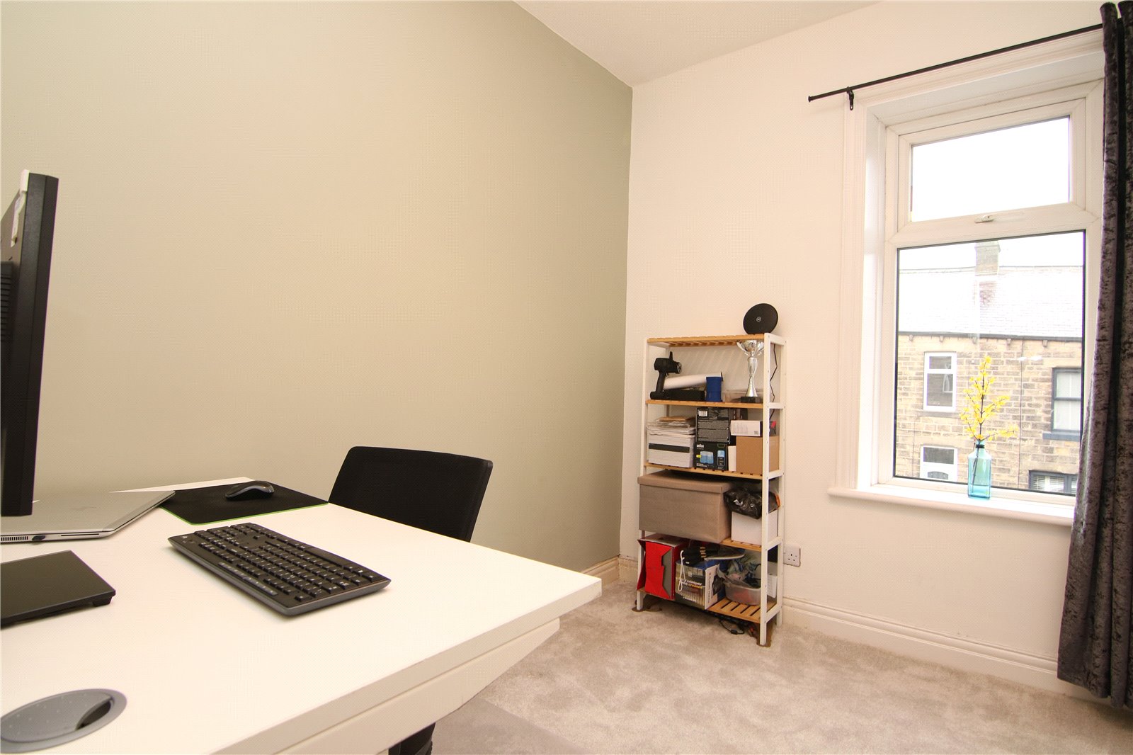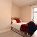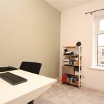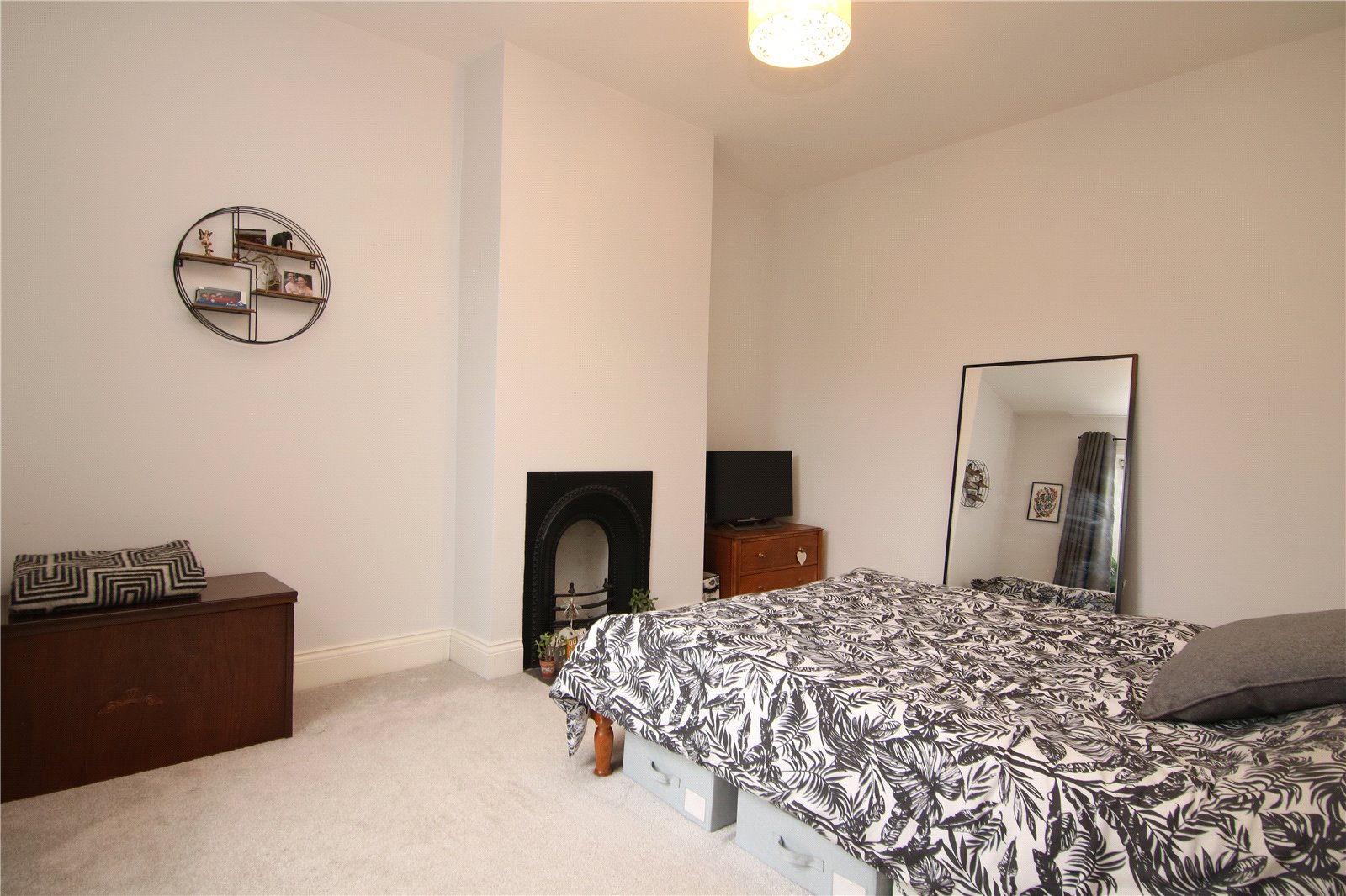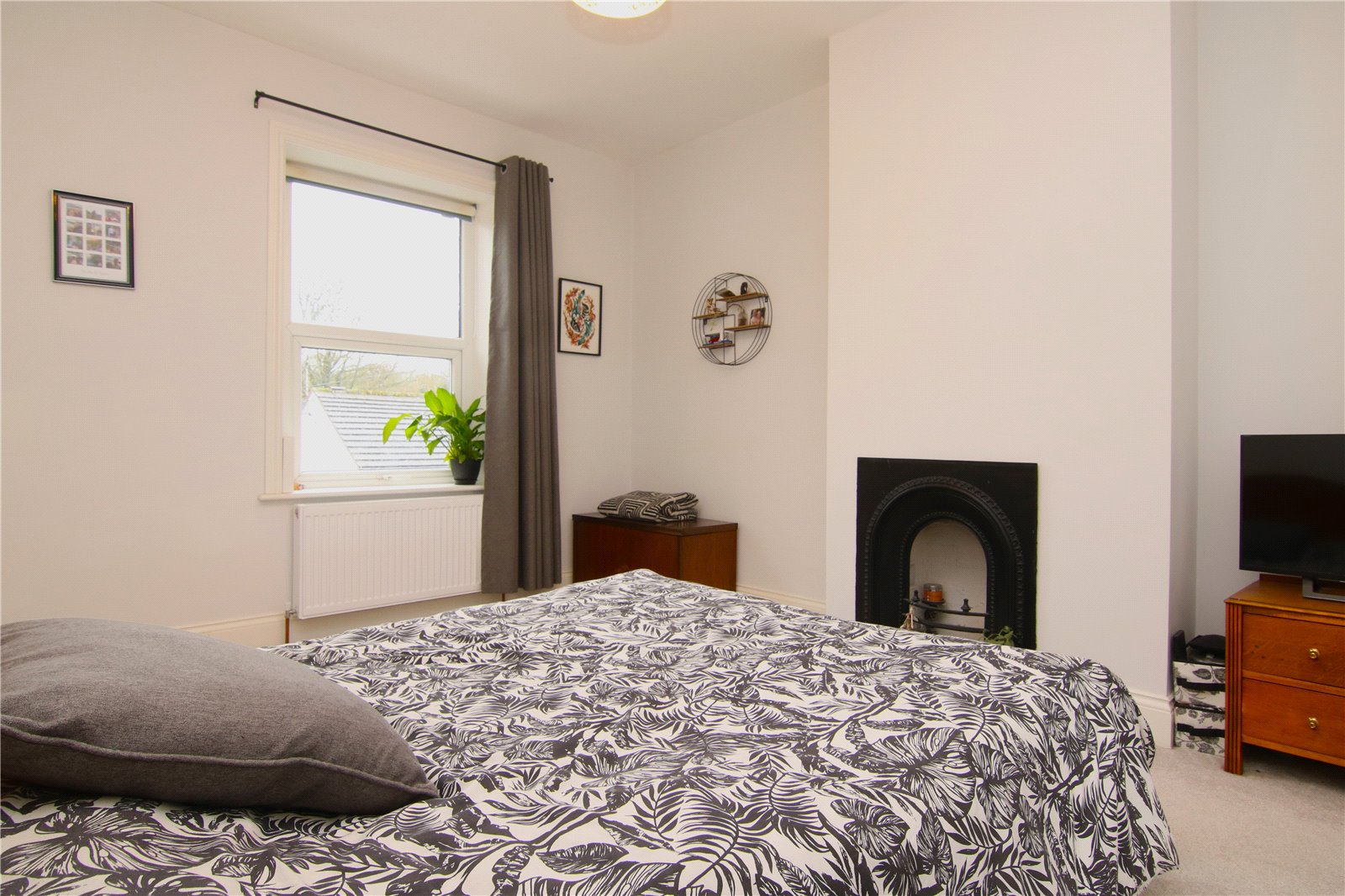 The principal bedroom overlooks the rear garden and comfortably accommodates a range of furniture, with an ornamental cast iron fireplace adding a nod to the home’s history. To the front are two further bedrooms, a smaller double and a good sized single currently used as a home office. A sleek house bathroom completes the first floor.