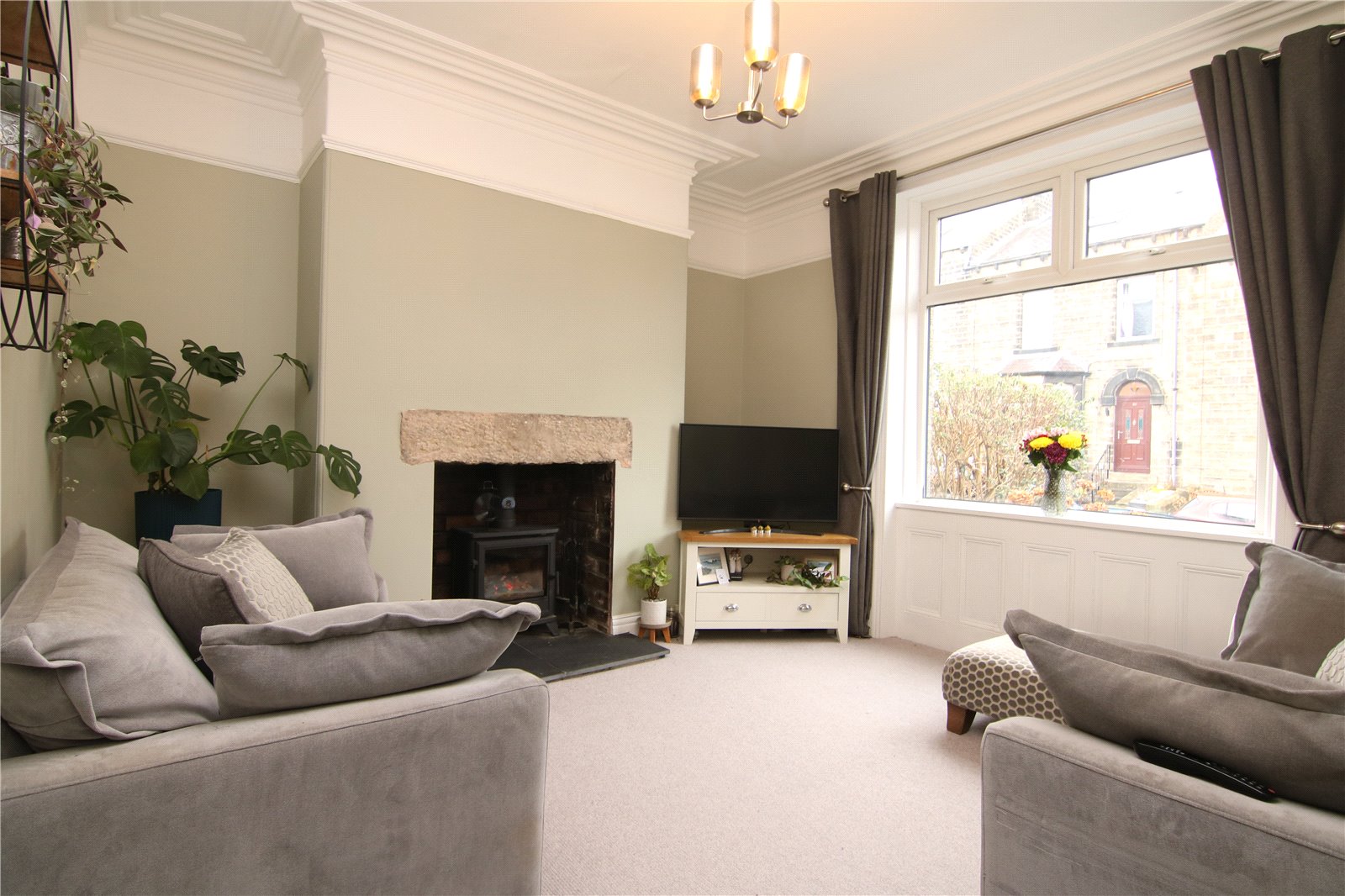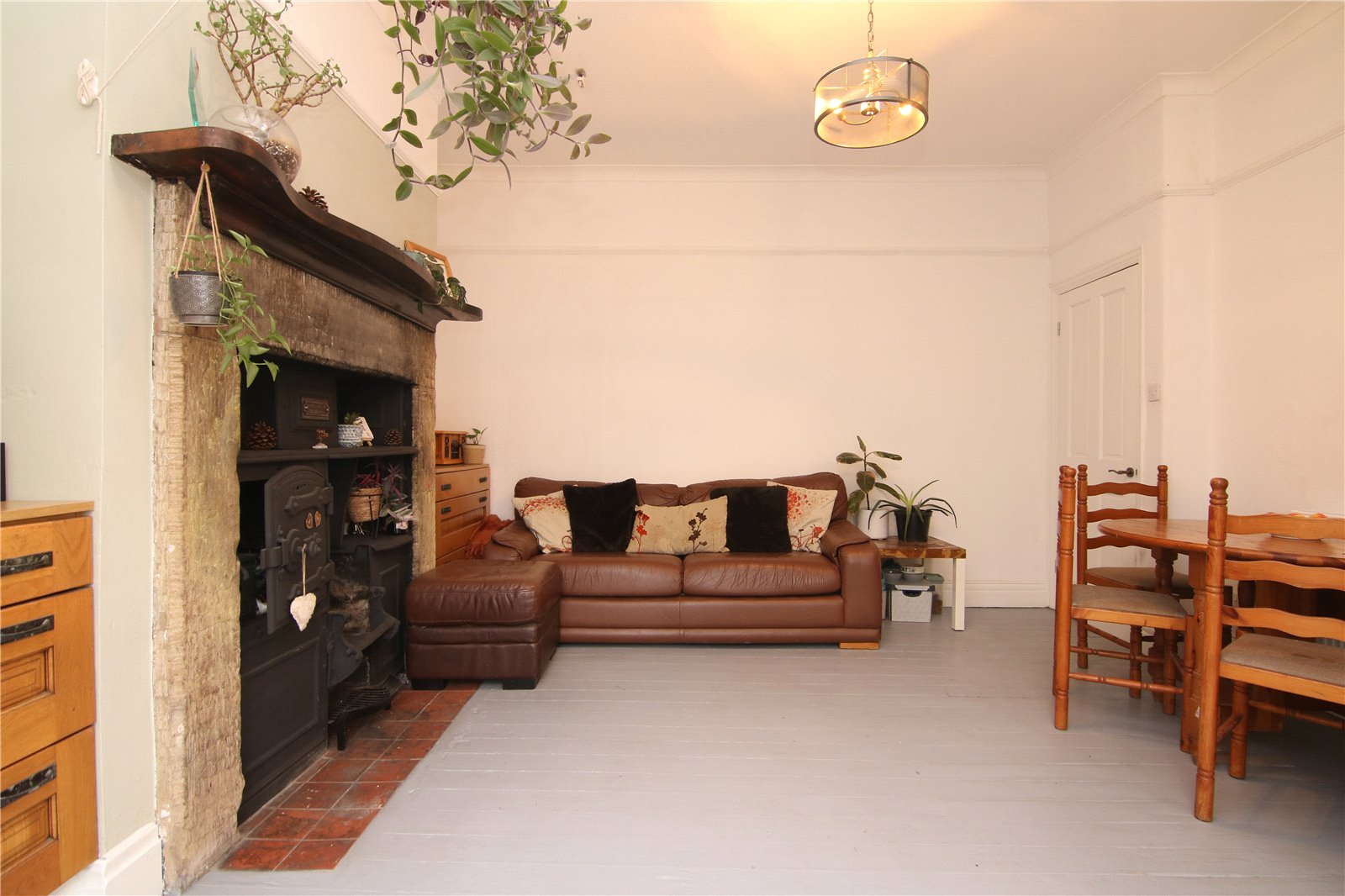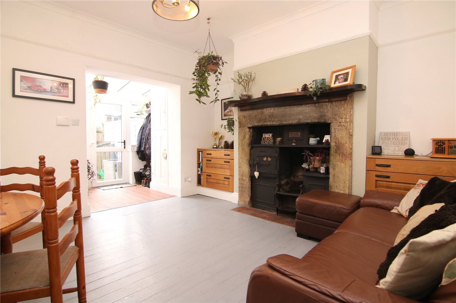 To the right sits the living room, a comfortable and well balanced space centred around a log burning stove set within an exposed brick fireplace. Ceiling coving, picture rails and panelling beneath the large window add depth and interest, creating a room that works well for everyday living.
