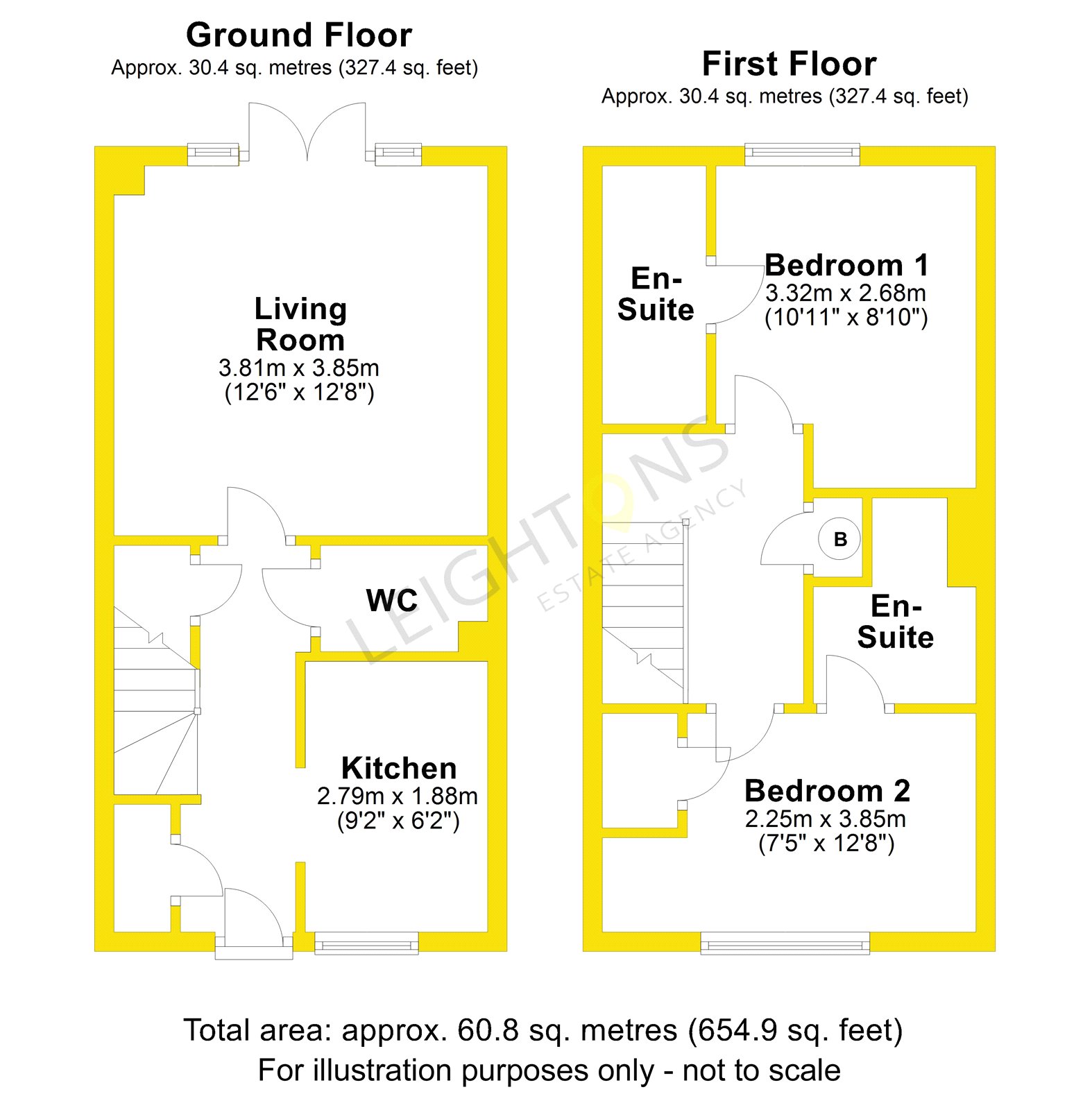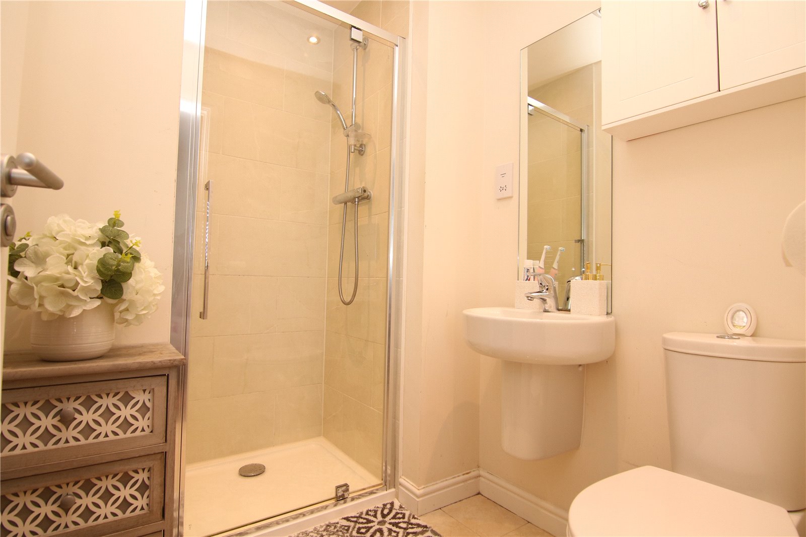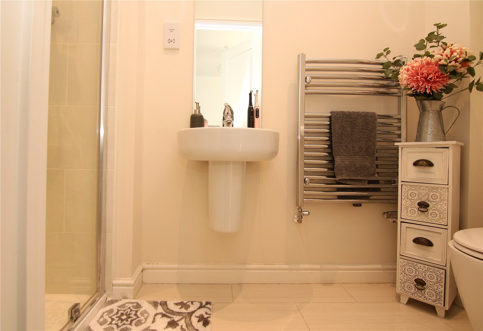 The first floor has a central landing with an additional storage cupboard. Two double bedrooms are located here, each with its own en-suite facilities. The front bedroom also includes storage positioned above the staircase, making full use of the available space.