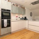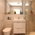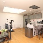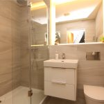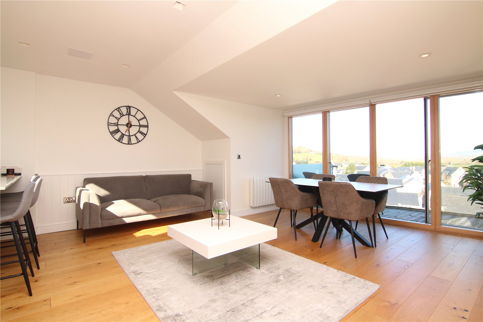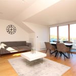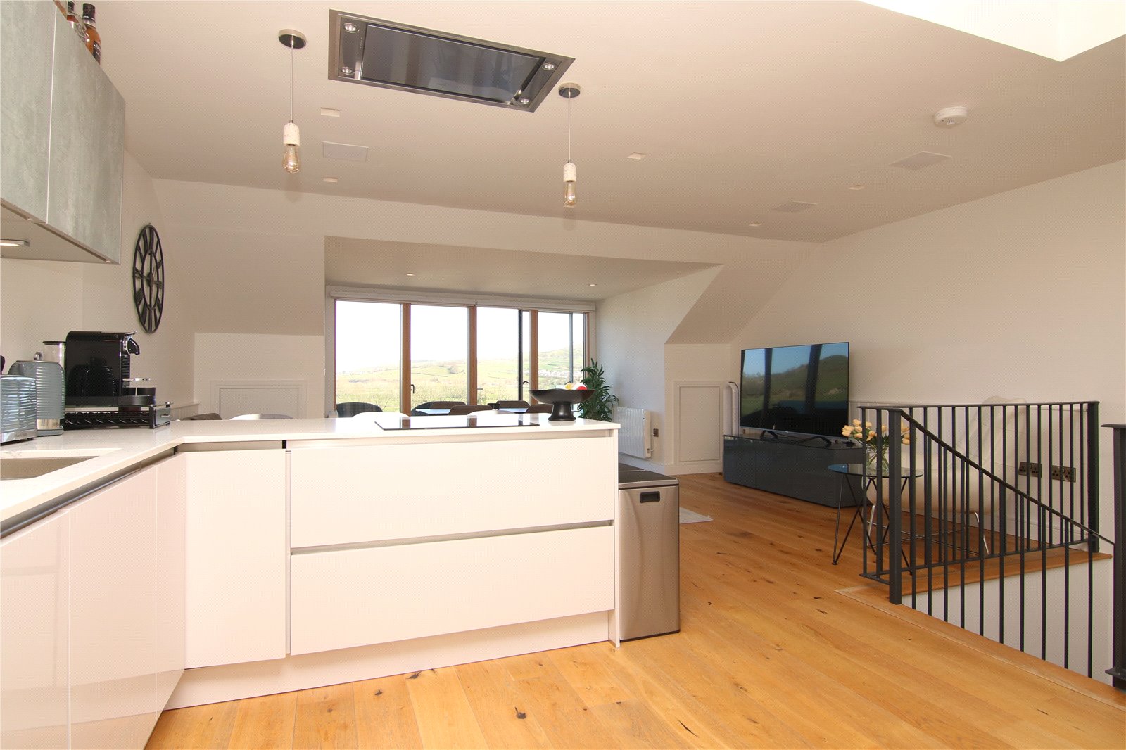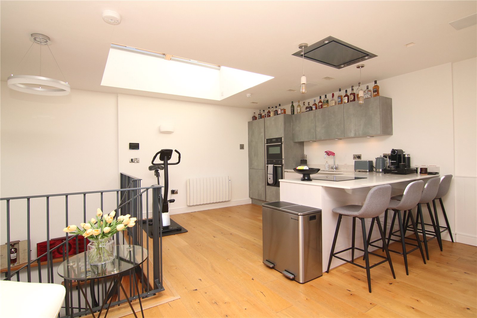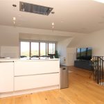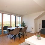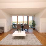 Upstairs, the main living area is a real feature of the apartment. This open plan living and dining space feels bright and airy, with wooden flooring, built in storage and large doors opening onto a generous sun terrace with outstanding views. The kitchen sits at the rear and space and has a huge Velux window flooding the space with plenty of natural light. There is a range of contrasting wall and base units with Quartz worktops and integrated Neff appliances.