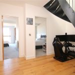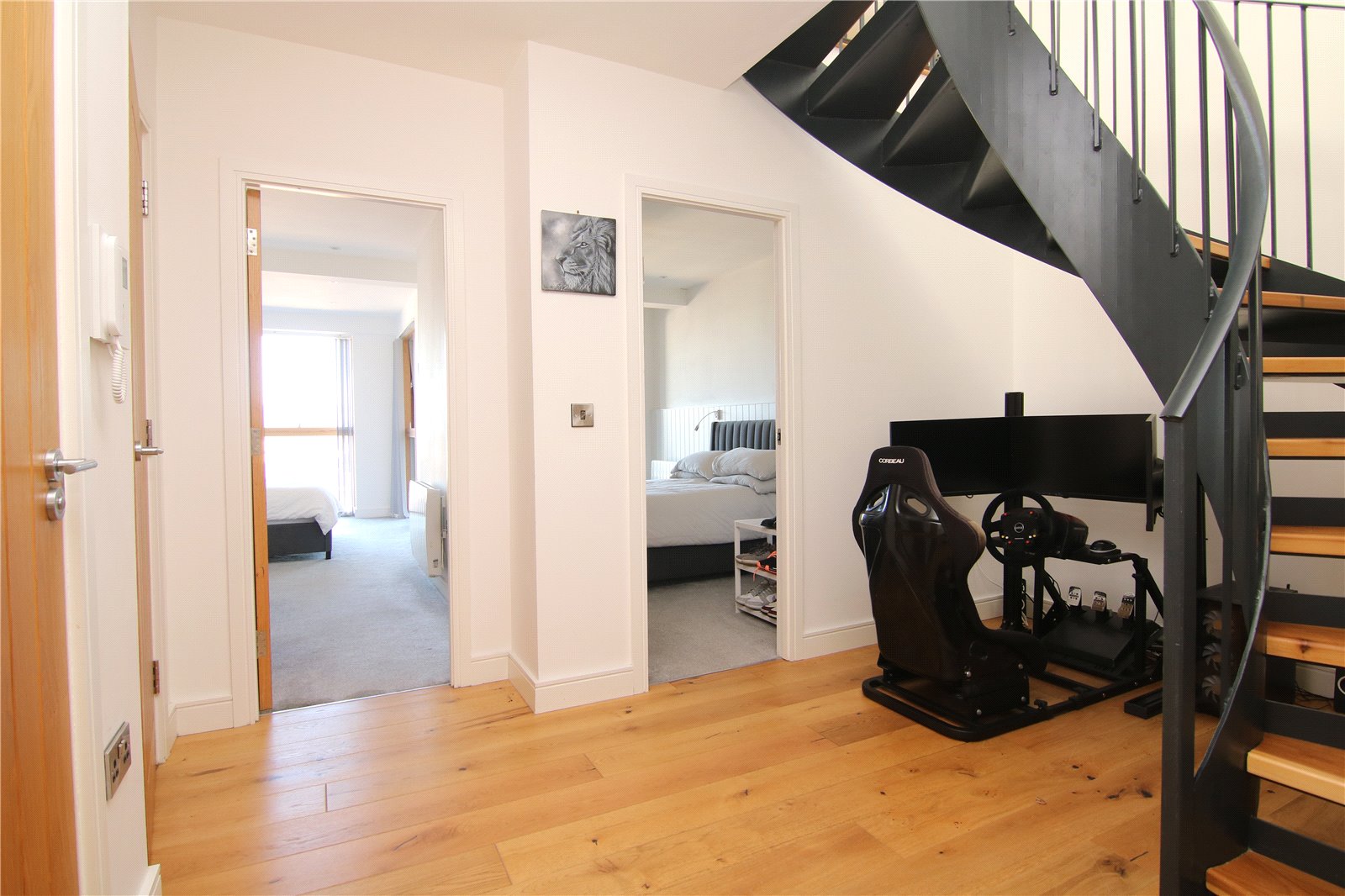 The communal areas are beautifully kept, with secure intercom entry, a furnished reception area and lift access to the third floor. Inside, the apartment opens into a spacious hallway with Oak flooring, useful storage and a striking curved staircase leading to the main living space above, with space underneath that works great as a space to work from home.