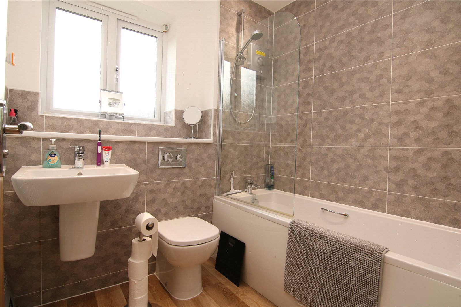 Upstairs, the master bedroom overlooks the rear garden and includes fitted mirrored wardrobes and a generous en-suite shower room. Three further double bedrooms provide flexible accommodation, with the front rooms enjoying an attractive outlook over the adjoining countryside and stream. A modern family bathroom and storage cupboard complete the first floor.