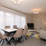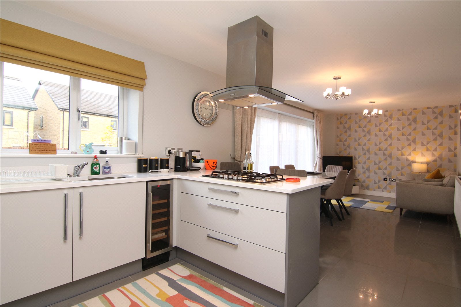 To the left is a well-proportioned living room overlooking the front of the property, ideal for a range of furniture layouts. The rear of the house is where it really comes into its own, with a superb open-plan kitchen and family room stretching across the full width of the home. This space has tiled flooring, room for dining and seating areas, and a fitted kitchen with quality units and integrated appliances. Bi-fold doors open directly onto the rear garden, creating an easy link between indoor and outdoor spaces and making it a great setting for everyday living.