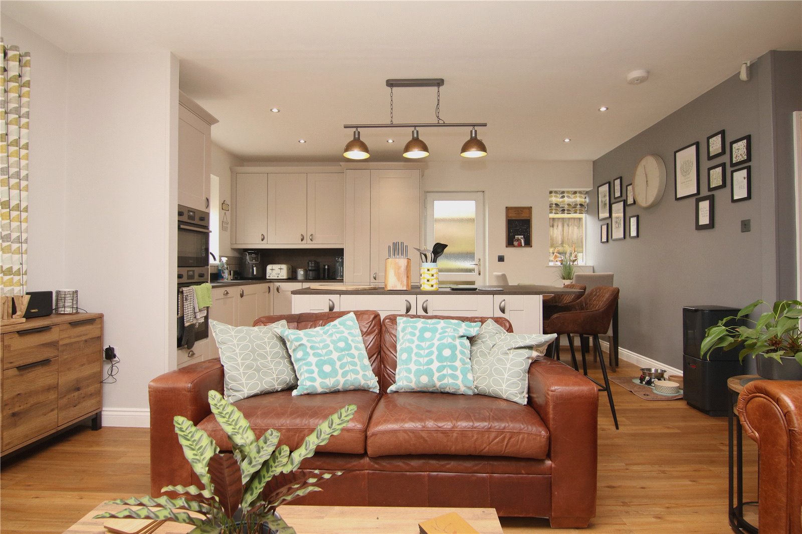 At the end of the hallway is the standout feature of the home. The open plan living kitchen is a bright and sociable space designed for everyday living. The living area has ample room for sofas and chairs and benefits from a large window with a deep sill which brings plenty of natural light into the room.